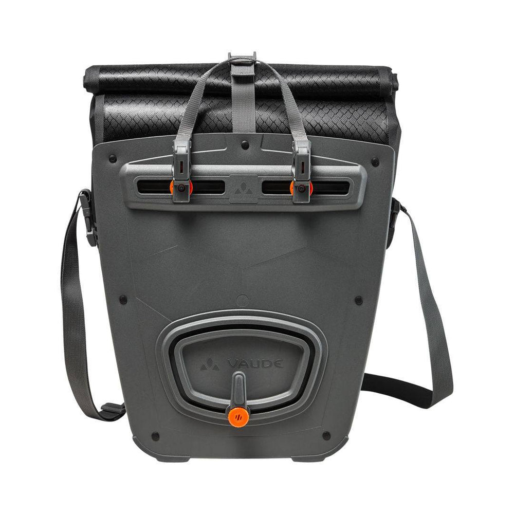 Für Pendler, die auch im Dunkeln unterwegs sind! Die wasserdichten Hinterradtaschen mit grossem, stark reflektierenden Druck werden aus robustem, PVC-freiem Planen-Material am deutschen VAUDE-Standort in der Nähe des Bodensees im Hochfrequenz-Schweissverfahren hergestellt. Sie lassen sich durch den Wickelverschluss auf individuelle Grössen bringen und absolut dicht verschliessen. Für Übersichtlichkeit sorgt jeweils eine Innentasche mit kleinen, aufgesetzten Reissverschluss-Netztaschen. Die Radtaschen werden mit dem QMR 2.0-System und stabiler Rückenplatte am hinteren Gepäckträger befestigt. Ein Zug am die beiden Haken verbindenden Band öffnet das System komfortabel. Das mit einem kleinen Schloss (z. B. Abus 145/10, nicht im Lieferumfang enthalten) absperrbare System ist einfach über Handrädchen justierbar und wird durch den flexibel einstellbaren, unteren Rail Hook komplettiert. Ein praktischer Schultergurt erleichtert den Transport zu Fuss. Für Pendler, die auch in Dämmerung und Dunkelheit unterwegs sind, sind diese stark reflektierenden Radtaschen ein Must have für den täglichen Weg zur Arbeit. Zudem ist dieses Produkt klimaneutral: Die Emissionen aus Materialien, Herstellungsprozess und Versand wurden ganzheitlich ermittelt und systematisch reduziert. Aktuell nicht vermeidbare Emissionen wurden vollständig über die unabhängige Non-Profit-Organisation ?myclimate•kompensiert. Die Aqua Back Luminum Taschen können durch diese praktischen Accessoires ergänzt werden: Toolbag Back, Sortyour Back, Addita Bag. Lieferumfang: 1 Paar Taschen