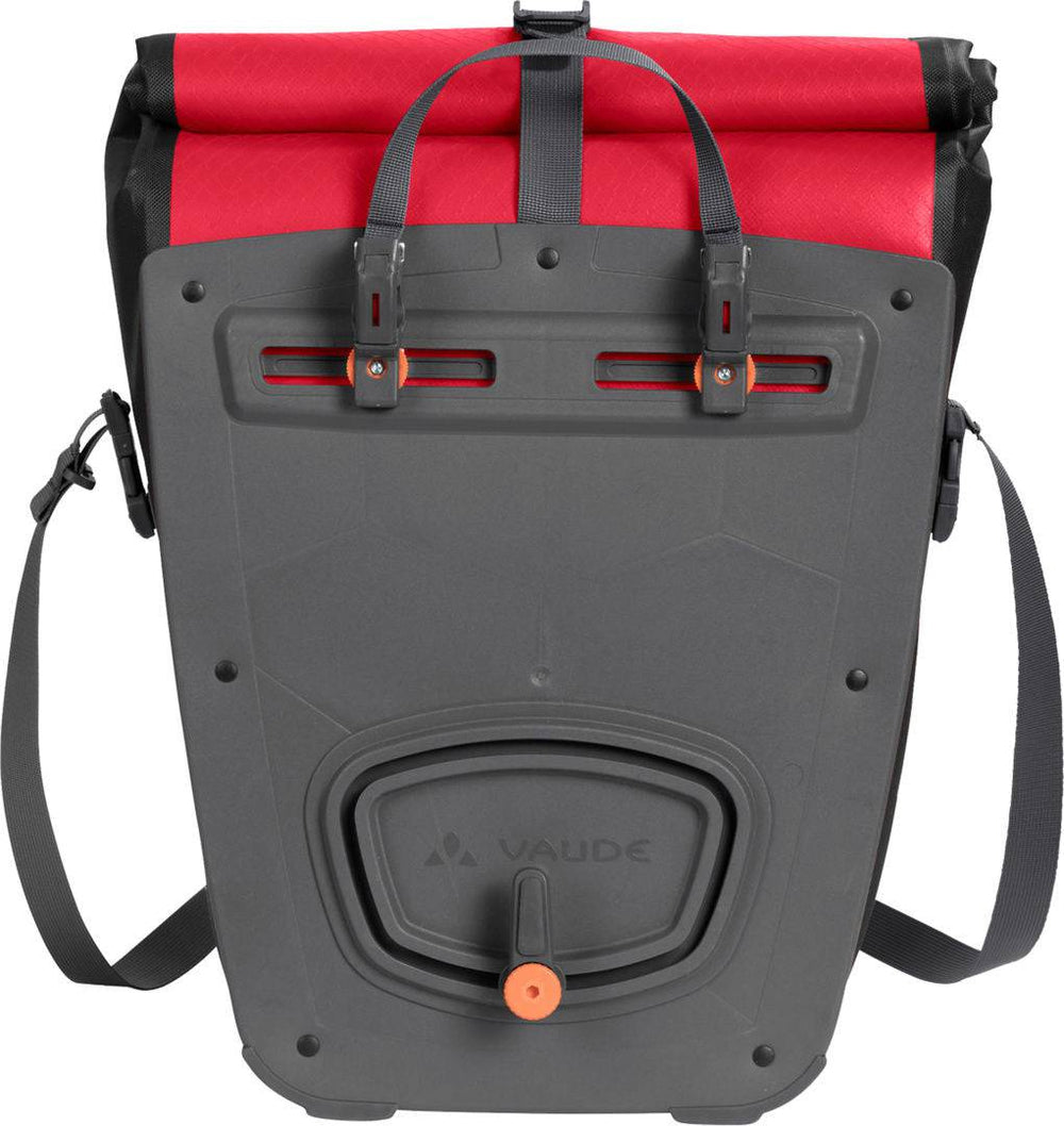 Auf in die grosse, weite Welt! Die wasserdichten Hinterradtaschen werden aus robustem, PVC-freiem Planenmaterial klimaneutral am deutschen VAUDE-Standort in der Nähe des Bodensees hergestellt und würden gerne mit Dir auf grosse Reisen gehen. Sie lassen sich durch den Wickelverschluss auf individuelle Grössen bringen und absolut dicht verschliessen. Für Übersichtlichkeit sorgen eine einfache Innentasche sowie die aufgeschweisste Aussentasche. Die Radtaschen werden mit dem QMR 2.0-System und stabiler Rückenplatte rechts und links am hinteren Gepäckträger befestigt, sind über einfach bedienbare Handrädchen justierbar und lassen sich schnell und einfach abnehmen. Mit einem Fahrradschloss können sie direkt am QMR-Haken verriegelt werden. Mit reflektierenden Elementen. Lieferumfang: zwei Taschen (Paar). Das Gesamtvolumen beider Taschen beträgt 51 Liter. Kann durch diese praktische Zubehör-Taschen ergänzt werden: Toolbag Back, Sortyour Back, Addita Bag.